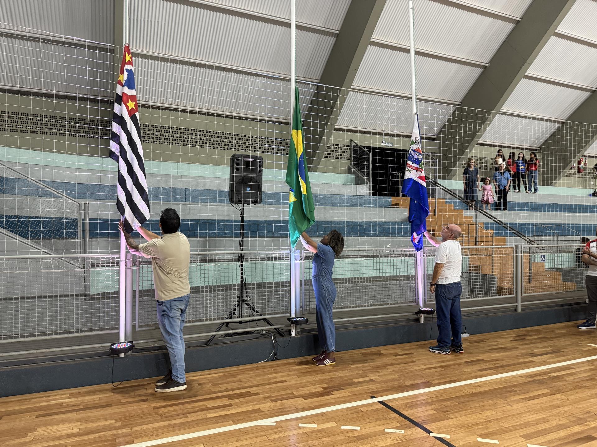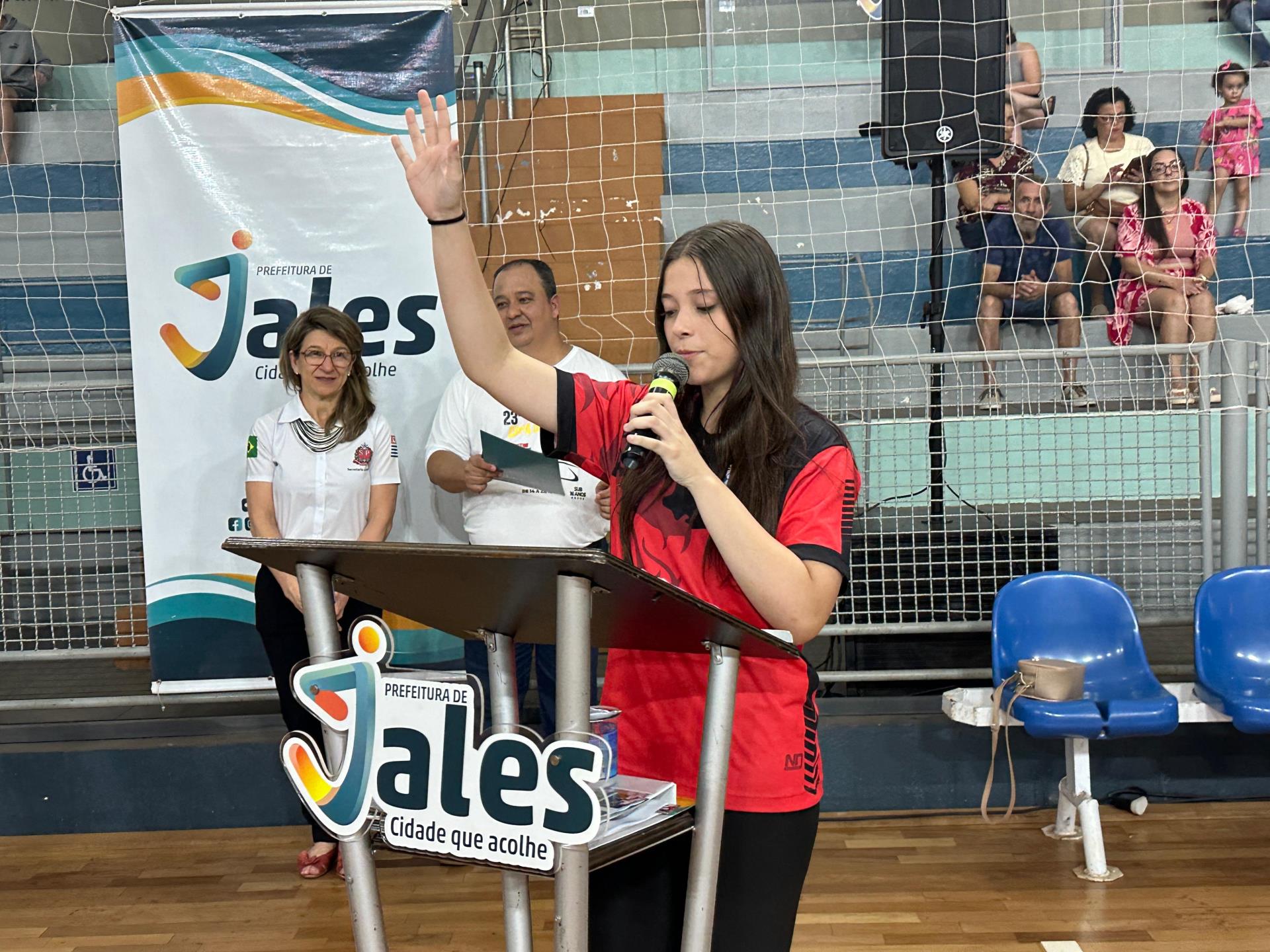 Em seguida, foram executados o Hino Nacional Brasileiro e o Hino de Jales, durante o hasteamento dos pavilhões do Brasil, do Estado de São Paulo e do município. Um dos pontos mais simbólicos da cerimônia foi a entrada do fogo simbólico, conduzido pelo atleta Luan Ribeiro Miotto, que teve seu currículo esportivo destacado diante do público, ressaltando conquistas expressivas em Jogos Escolares, Jogos Regionais e ligas estaduais. Logo depois, a atleta jalesense Isabela Ricci Bergamo realizou o juramento do atleta, reforçando o compromisso com a ética, o respeito e a lealdade durante as competições. As autoridades presentes fizeram uso da palavra, e a secretária estadual de Esportes, Coronel Helena Reis, declarou oficialmente aberta a Final Estadual da 23ª Copa de Handebol do Estado de São Paulo – edição 2025.